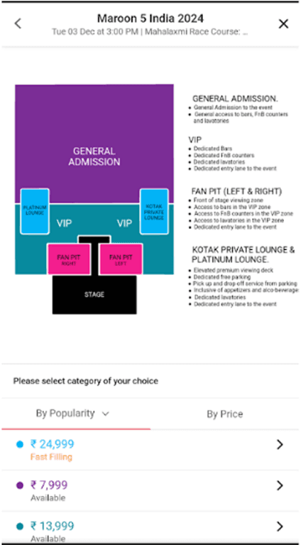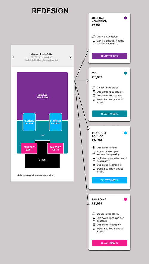 While reviewing the ticket booking interface for Maroon 5’s India 2024 concert, I noticed that the original design was cluttered, text-heavy, and unintuitive. The seat map was static, and users had to scroll separately to understand prices and benefits, making the experience frustrating.