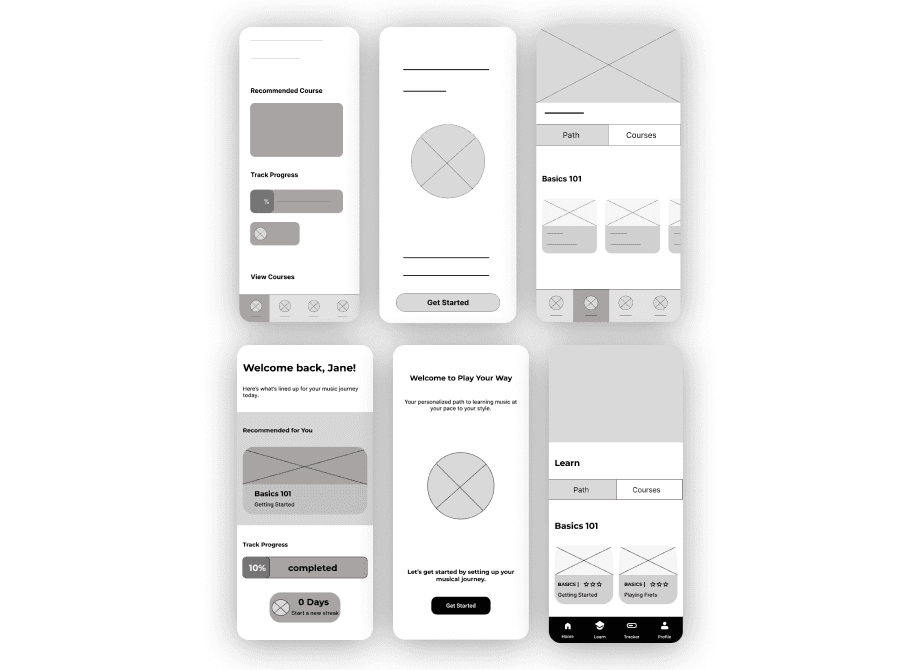 I began with low-fi sketches and digital wireframes to test navigation clarity and the progress tracker. Iterations focused on simplifying the learning flow and making progress more visible. Below you can see the transition from Low-fi sketches → Digital wireframes