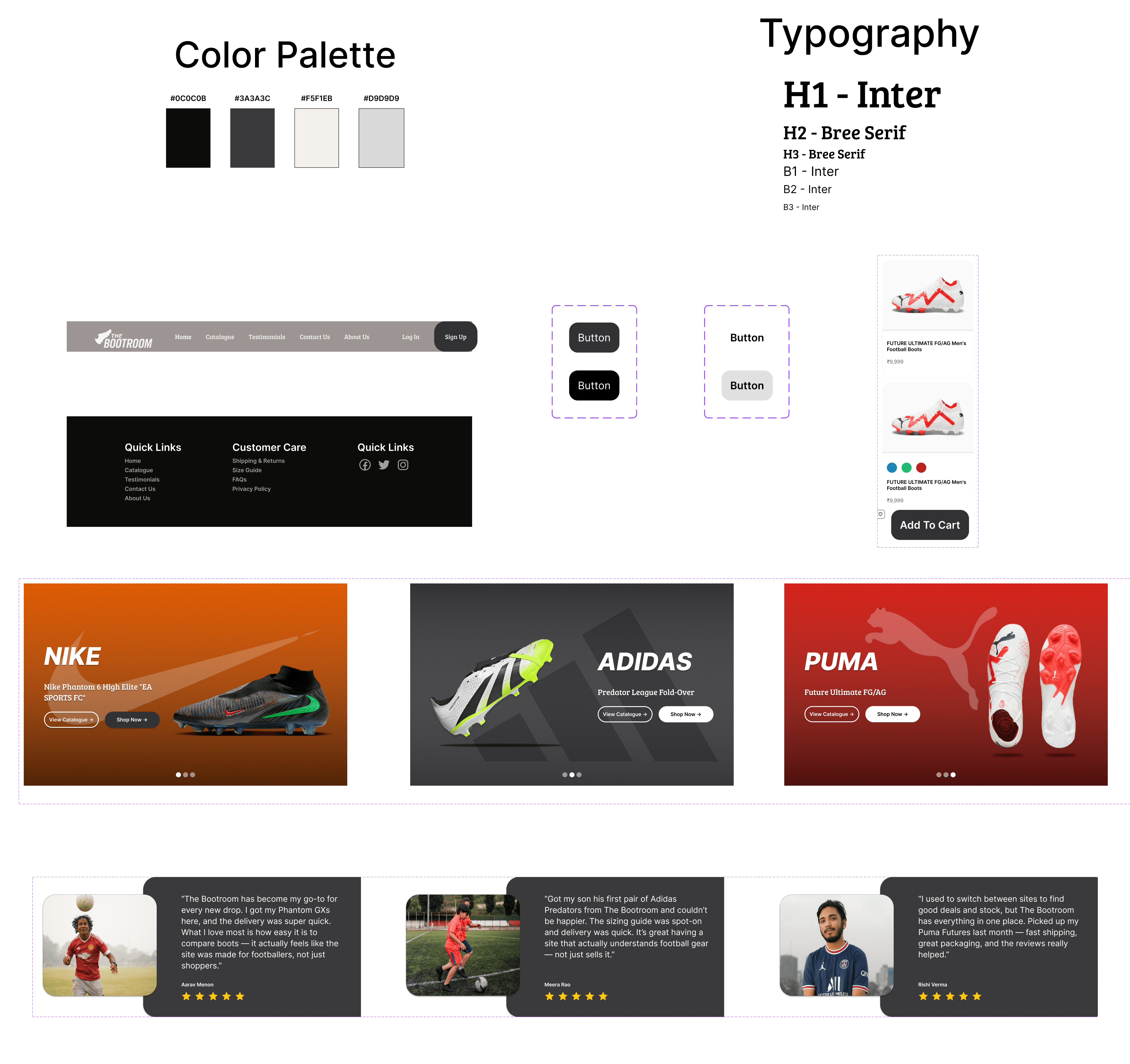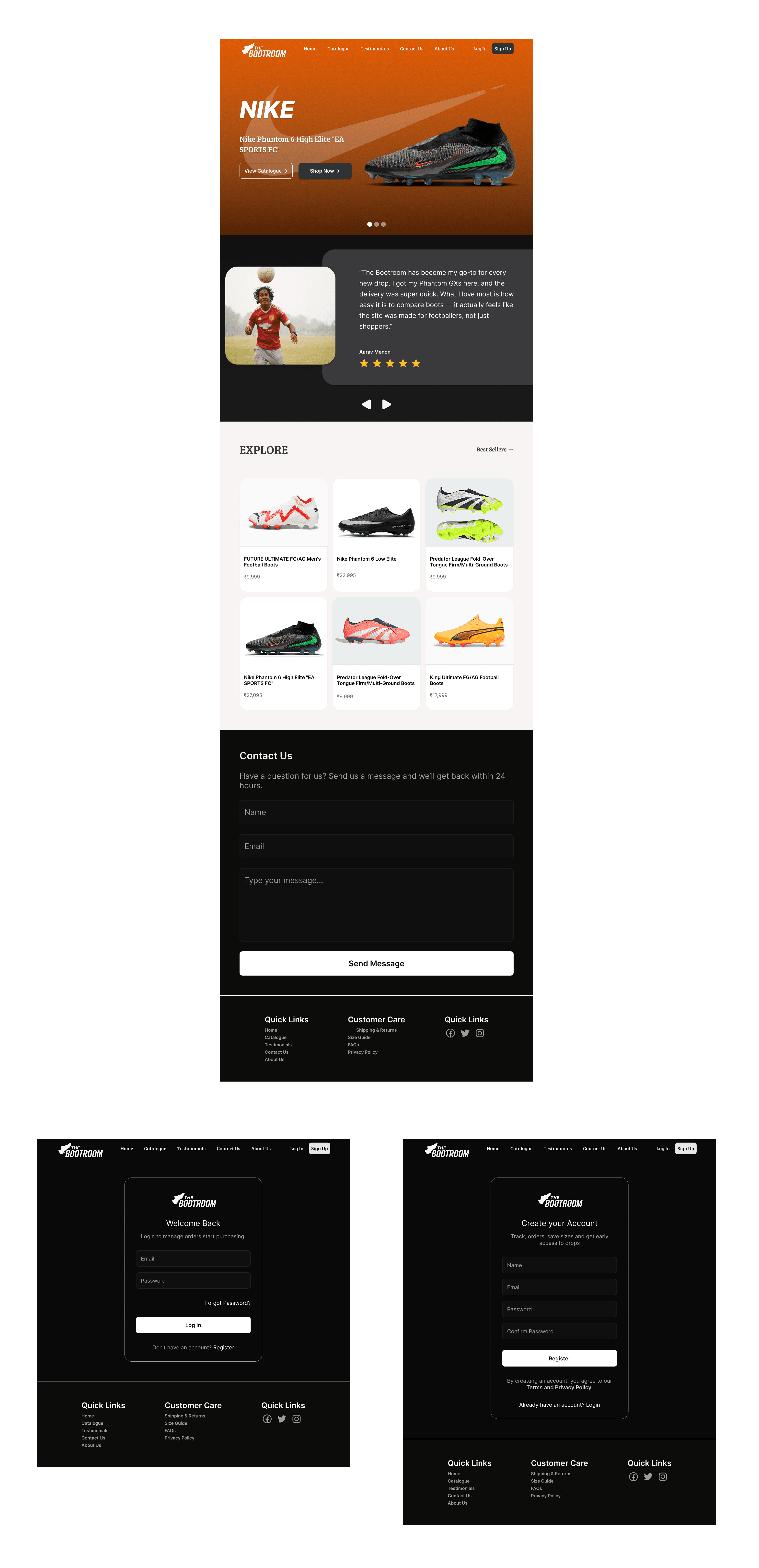 The Bootroom is a modern e-commerce concept created to give footballers and enthusiasts one platform to explore and purchase their favorite boots from top brands like Nike, Adidas, and Puma. The goal was to merge the energy of football culture with a premium, performance-driven shopping experience.