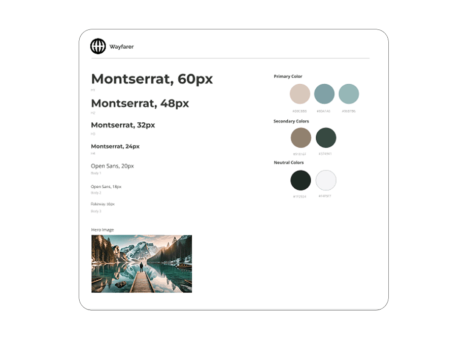 The style tile showcased the colors and fonts that I’ve chosen to represent the websites brand, these were derived from the Hero image.